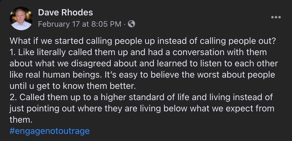 One of the best things I’ve seen written in the past few days was from my friend Dave Rhodes, who suggested that instead of calling people out, maybe we should call them up.